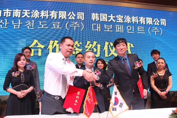 【中國涂料材料網(wǎng)】2月5日,中山南天涂料有限公司(以下簡稱“南天涂料”)與韓國大寶涂料有限公司(以下簡稱“韓國大寶”)在中山小欖舉行了隆重的簽約合作儀式。南天涂料董事長張銓秋、總經(jīng)理祝燕弟、韓國大寶董事長李昌錫,及雙方公司高層領(lǐng)導(dǎo)、南天涂料大連經(jīng)銷商李永強、律師劉值林共同參與見證,來自南天涂料經(jīng)銷商、供應(yīng)商、公司員工、媒體約500人共同慶賀雙方合作成功。