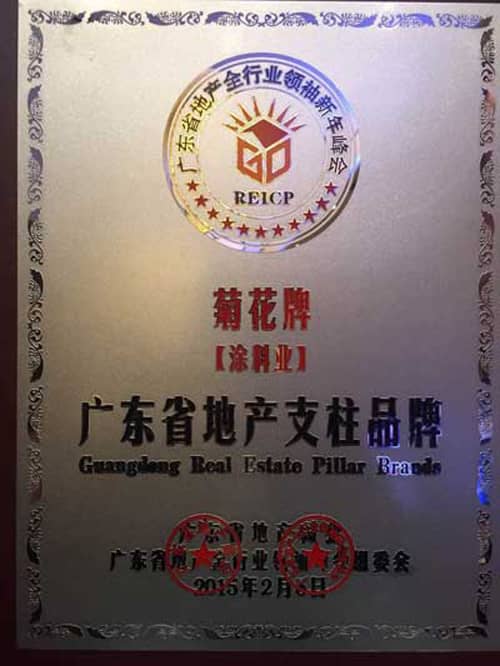 菊花牌漆在香港已經(jīng)有八十余年歷史,是廣受歡迎的家居及建筑專用漆,于2001年度榮獲香港名牌,2005年獲得中國名牌。菊花牌之建筑漆產(chǎn)品系列齊全且品質(zhì)優(yōu)良,為客戶提供一站式的油漆配套選擇,產(chǎn)品廣泛應(yīng)用于香港及中國大陸的裝修、建筑及維修工程項(xiàng)目,在商業(yè)住宅、酒店飯店、市政工程、以及火車站、機(jī)場等大型項(xiàng)目中得到廣泛的應(yīng)用。菊花牌的戰(zhàn)略合作客戶有碧桂園集團(tuán)、雅居樂、招商地產(chǎn)、越秀地產(chǎn)、恒大地產(chǎn)集團(tuán)等。菊花牌涂料一直堅持以高品質(zhì)的產(chǎn)品服務(wù)客戶,經(jīng)過多年來市場的檢驗(yàn),是深受廣大客戶喜愛的涂料品牌。本次榮獲“廣東省地產(chǎn)支柱品牌”,是對菊花牌涂料高品質(zhì)的認(rèn)可和信賴。菊花牌涂料將一直秉承高品質(zhì)的產(chǎn)品質(zhì)量,以市場為導(dǎo)向,一如既往地服務(wù)廣大客戶。