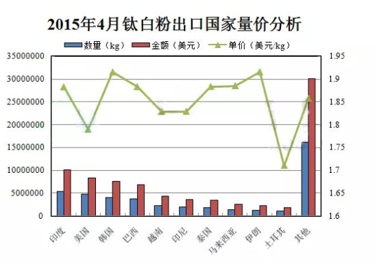 據(jù)海關(guān)總署數(shù)據(jù)統(tǒng)計(jì)分析,2015年4月國內(nèi)鈦白粉出口目的地共計(jì)79個,其中出口前五目的地依次為印度、美國、韓國、巴西以及越南,數(shù)量分別為5,382噸、4,678噸、3,937噸、3,723噸和2,292噸,占比依次占12.35%、10.73%、9.03%、8.54%和5.26%。