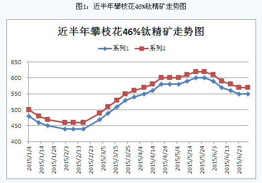 2、從圖1中攀枝花鈦精礦走勢(shì)圖來(lái)看,攀西地區(qū)鈦精礦5月底沖高回落,到6月底跌勢(shì)有所放緩。據(jù)昊客市場(chǎng)調(diào)研了解到,目前攀西地區(qū)鈦中礦成本仍高居不下,在目前鈦中礦成本支撐作用下,短期鈦精礦價(jià)格繼續(xù)下跌空間有限,后市市場(chǎng)走勢(shì)仍應(yīng)視下游需求持續(xù)性而定。業(yè)內(nèi)人士反映,7月份是關(guān)鍵的一個(gè)月份,起著年度承上啟下的作用。