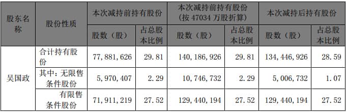 4、本次減持后,吳國政先生仍持有公司股份 134,446,926 股,占公司總股本的 28.59%;仍是公司實(shí)際控制人、控股股東。