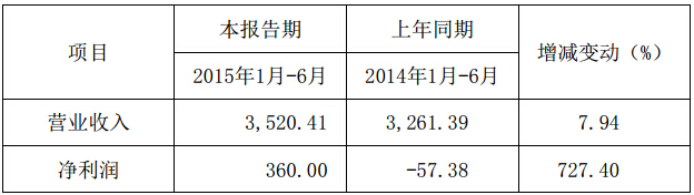 經公司財務部門初步測算,預計2015 年半年度營業收入與上年同期相比,約增長7.94%;預計凈利潤與上年同期相比,增長約727.40%。具體如下: