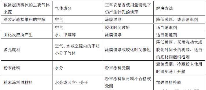 總之,粉末涂料針孔(泡孔)的形成原因是多方面的,究其根本原因,是隨著固化時體系黏度的增加,被裹挾(Entrapped)在涂層內的小分子氣體聚集且來不及釋放而形成。被裹挾在涂層內的小分子來源包括:粉末涂料涂裝時所疏松堆積的空氣(粉末涂料原生性的)、某些固化反應所產生的水、甲醇等小分子、來自多孔底材內部的小分子氣體,以及粉末原料或粉末成品存儲不當而引入的小分子氣體等。可以針對不同的原因,采取相應的解決方法: