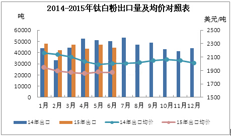 由上圖可以看到,雖然5月份出口環(huán)比回升,但是好景不長,6月份最新數(shù)據(jù)來看,鈦白粉出口再度出現(xiàn)環(huán)比及同比雙雙下跌的情況,數(shù)據(jù)顯示,6月份鈦白粉出口44216.58噸,環(huán)比下跌6.47%,同比下跌11.63%,整體上半年來看下跌1.15%。