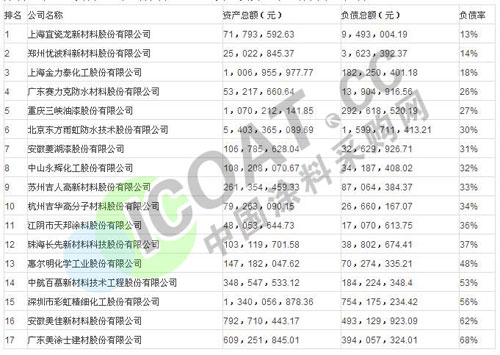 由上表涂料上市企業公布的總資產與負債資產金額,中國涂料采購網匯總出了各上市企業的負債率并對其進行了排名。在上表收錄的17家涂料上市企業及新三板掛牌涂料企業中,整體看來除了安徽美佳和美涂士之外,其它各涂料企業的負債經營情況都較為合理,安徽美佳的負債率達到62%已經越過安全線,而廣東美涂士的資產負債率竟達68%,觸碰“高壓線”亮起資金流轉的“紅燈”已不可避免。
