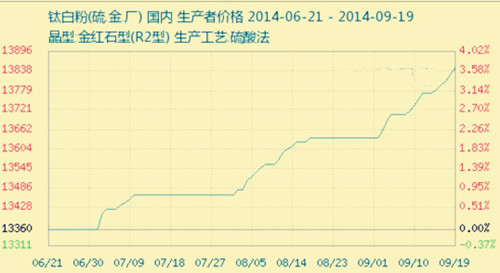 “金九”到來,國內金紅石型鈦白粉市場利多開局,跟漲有先后,中旬的市場已接近平穩,不管是真正提價還是“明漲實穩”,第六次調漲的氣氛已經形成。經過半年的漲價,鈦白粉的整體價格水平已提升千元以上,無奈實際成交的價格永遠是一個矛盾體,生產商或經銷商希望利潤最大化,下游客戶希望成本最低化,最終目標都是希望賺現錢、多賺錢,經過幾番調漲下游采購商盡管艱難,但也在漸漸接受,供需價格平衡點已側移,試探性的改變就是在發現生產商、經銷商生存“舒服”,下游采購商接受“不困難”的“黃金分割點”,市場不是理想的模型,所以這樣的“平衡點”總在利益的周圍擺動,永無休止。時至第三季度末,鈦白粉概念股的若干上市公司面臨出第三季報,或就此加強與龍頭企業橫向聯系,再加一波逆漲,逞威第三季度末,至少為季報“添彩”,也為鈦白粉后市利多增加一小塊砝碼。目前國內多數硫酸法金紅石型和銳鈦型鈦白粉的主流報價在12100-13900元/噸和9500-10800元/噸(均含稅)。