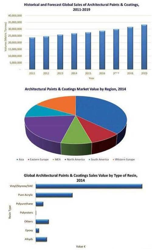 中國涂料采購網】近期,IRL首次發布了全球建筑涂料市場趨勢預測報告,建筑涂料市場將繼續保持持續穩定增長,預計2019年將突破3300萬噸,年均復合增長率4%左右,兩倍于全球經濟總量增長前景預測。建筑涂料全球市場容量將從2014年的490億歐元增長至2019年的610億歐元。