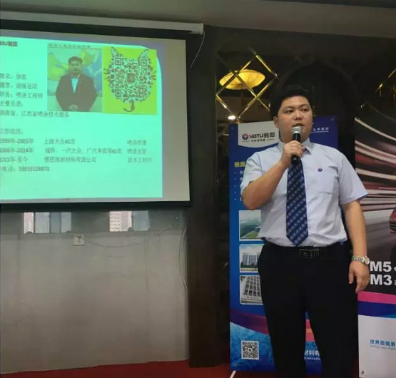 會(huì)議中,雅圖公司的華中區(qū)域的銷售經(jīng)理張經(jīng)理介紹了雅圖的服務(wù)團(tuán)隊(duì),技術(shù)工程師徐經(jīng)理介紹了雅圖優(yōu)質(zhì)環(huán)保的汽車漆產(chǎn)品與鈑噴標(biāo)準(zhǔn)流程。