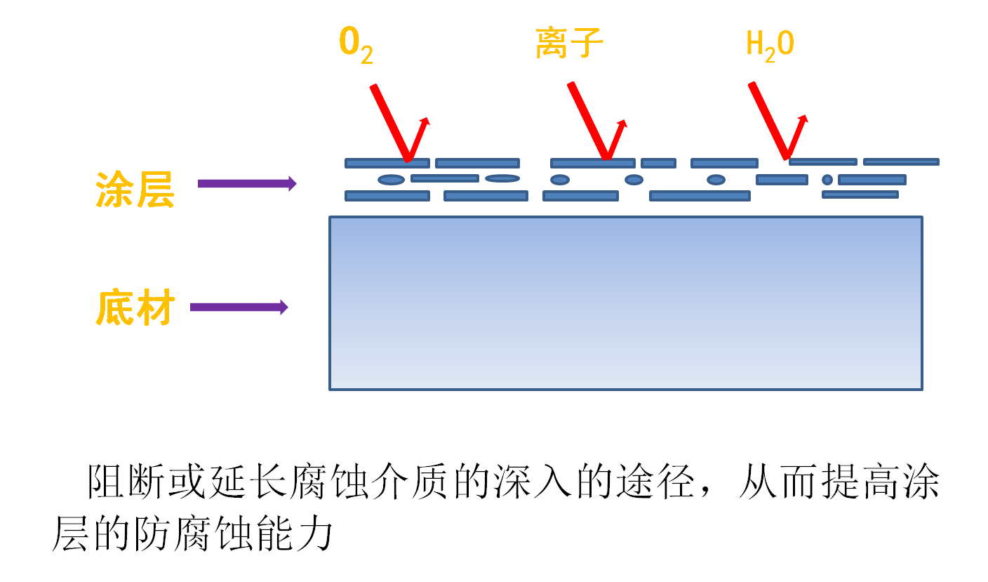 由于在防腐蝕涂料的成膜過程中對底材的潤濕程度、表面張力的均衡、溶劑的殘留以及施工等因素的影響,涂料漆膜都存在一定的透水性和吸水性。這就大大的增加了水、氧氣和離子滲透的幾率,而這些都是造成金屬底材腐蝕的主要原因。所以在涂料中增加片狀顏料能有效的屏蔽水、氧氣和離子等腐蝕因子透過,切斷涂層中的毛細孔。從而阻斷或延長腐蝕介質的深入的途徑,從而提高涂層的防腐蝕能力。例如氧化鐵紅、云母粉、鋁粉、云母氧化鐵、玻璃鱗片、不銹鋼鱗片等[3]。