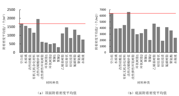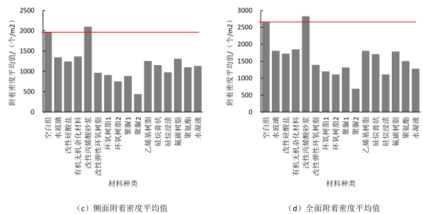 空白和帶涂層試件上的淡水殼菜的附著個(gè)數(shù)見(jiàn)表 2 所示。附著個(gè)數(shù)除以附著面積即可得到平均附著密度,各涂料不同部位的平均附著密度如圖 2 所示,除改性丙烯酸砂漿外(由于施工工藝的原因?qū)е峦繉颖砻娲植诓黄?,圖 3),其余涂料的附著密度均低于空白組,說(shuō)明其余涂料確實(shí)有效降低了淡水殼菜的附著。從各涂料頂面附著密度平均值來(lái)看,空白組的附著密度為 1689 個(gè)/m 2 ,防附著效果排在前列的幾種材料(低于空白組附著密度的 50%)分別是聚脲 2、環(huán)氧樹(shù)脂 2、聚脲 1、環(huán)氧樹(shù)脂 1、改性彈性環(huán)氧樹(shù)脂、永凝液和硅烷浸漬,其中聚脲 2 的附著密度是空白組的 18%(圖 2 a);從各涂料底面附著密度平均值來(lái)看,空白組的附著密度為 6400 個(gè)/m 2 ,防附著效果排在前列的幾種材料(低于空白組附著密度的50%)分別是硅烷浸漬、聚脲 2、永凝液、環(huán)氧樹(shù)脂 1和環(huán)氧樹(shù)脂 2,其中硅烷浸漬的附著密度是空白組的 37%(圖 2 b);從各涂料側(cè)面附著密度平均值來(lái)看,空白組的附著密度為 1967 個(gè)/m 2 ,防附著效果排在前列的幾種材料(低于空白組附著密度的 50%)分別是聚脲 2、環(huán)氧樹(shù)脂 2、聚脲 1、環(huán)氧樹(shù)脂 1、改性彈性環(huán)氧樹(shù)脂和硅烷浸漬,其中聚脲 2 的附著密度是空白組的 23%(圖 2 c);從各涂料全面附著密度平均值來(lái)看,空白組的附著密度為 2659 個(gè)/m 2 ,防附著效果排在前列的幾種材料(低于空白組附著密度的 50%)分別是聚脲 2、環(huán)氧樹(shù)脂 2、環(huán)氧樹(shù)脂 1、硅烷浸漬、永凝液和聚脲 1,其中聚脲 2 的附著密度是空白組的26%(圖 2 d)。綜上所述,在試件各部位均附著較少的涂料有聚脲 2、環(huán)氧樹(shù)脂 2、環(huán)氧樹(shù)脂 1和硅烷浸漬。