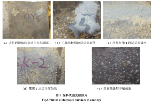 從各涂料在受侵蝕 9 個(gè)月后的表面完好程度來(lái)看,改性丙烯酸砂漿和乙烯基樹(shù)脂產(chǎn)生了局部剝落現(xiàn)象(圖 5a 和圖 5b),環(huán)氧樹(shù)脂 1 和聚脲 1產(chǎn)生了局部鼓泡的現(xiàn)象(圖 5c 和圖 5d),聚氨酯產(chǎn)生了普遍鼓泡的現(xiàn)象(圖 5e)。因此,這些涂料的耐久性不符合要求,應(yīng)予以排除。
