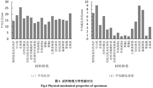 對(duì)于防附涂料的抗侵蝕性,硅烷浸漬、氟碳樹(shù)脂、改性硅酸鹽、乙烯基樹(shù)脂和永凝液對(duì)提高抗壓強(qiáng)度效果較好;永凝液、硅烷浸漬、聚脲 2、環(huán)氧樹(shù)脂 2 和有機(jī)無(wú)機(jī)雜化材料對(duì)于降低孔隙率效果稍好,聚脲 2、改性彈性環(huán)氧樹(shù)脂、聚脲 1 和環(huán)氧樹(shù)脂 1 對(duì)于降低平均孔徑效果最明顯;聚脲 2、環(huán)氧樹(shù)脂 2、改性彈性環(huán)氧樹(shù)脂、聚氨酯和聚脲 1 的抗碳化效果最明顯,而硅烷浸漬和氟碳樹(shù)脂對(duì)于抑制碳化幾乎沒(méi)有效果。