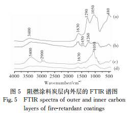 圖5的紅外譜圖中,曲線(1)與(2)分別是加有50份 LDH的阻燃涂料燃燒后炭層的內(nèi)層與外層,曲線(C)與(D)分別是不含LDH的阻燃涂料炭層的內(nèi)層與外層。從兩種涂料炭層內(nèi)外層的FTIR譜圖中可以看出,內(nèi)層曲線(a)和(c)的特征峰分別多于外層曲線(b)和(d)的特征峰,在炭層內(nèi)層結(jié)構(gòu)中,1250~1300cm-3范圍內(nèi)的P=O特征峰結(jié)構(gòu)得到更完整的保留,原因是阻燃體系中的 APP和 PER發(fā)生酯化反應(yīng),交聯(lián)形成立體網(wǎng)狀結(jié)構(gòu)、構(gòu)成炭層、同時(shí)產(chǎn)生氣體發(fā)泡,形成膨脹炭層,能夠有效阻隔氧和熱量的傳遞,很好地保護(hù)內(nèi)層物質(zhì),使得內(nèi)層的特征峰得以保留。