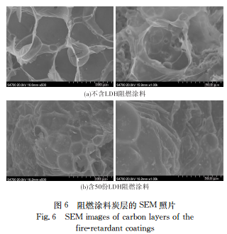 從圖6(a)可以看出,不含LDH的涂料燃燒后形成的炭層不均勻,結(jié)構(gòu)疏松,膨脹炭層內(nèi)只有大孔結(jié)構(gòu),孔洞大小不均勻而且數(shù)量少,在炭層斷面不具備多孔海綿狀結(jié)構(gòu)[11]。由于其炭層強(qiáng)度不夠,易被火焰破壞,故其耐燃時(shí)間短,僅為58min。從圖6(b)可以看出,加入50份LDH 的涂料燃料后炭層呈大量均勻致密的泡狀蜂窩結(jié)構(gòu),且氣泡大小均勻,炭質(zhì)層表面存在山脈狀的海綿狀結(jié)構(gòu),這些結(jié)構(gòu)保證了膨脹炭化層具有較高的強(qiáng)度,微小氣孔數(shù)量增加,降低了膨脹炭層整體的導(dǎo)熱系數(shù),使得通過(guò)膨脹炭層傳導(dǎo)到基材的熱量明顯減少,起到良好的隔熱防火的作用[2-14]。因而其耐燃時(shí)間延長(zhǎng)到165min。這說(shuō)明LDH的加入有效提高了涂料膨脹炭化層的整體強(qiáng)度,可以為基材提供有效防護(hù)。