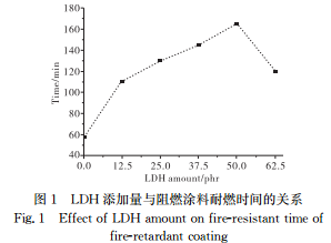 環(huán)氧樹脂為100份,LDH添加份數(shù)在0~62.5份之間,,測(cè)定環(huán)氧樹脂阻燃涂料的耐燃時(shí)間,結(jié)果見圖3。