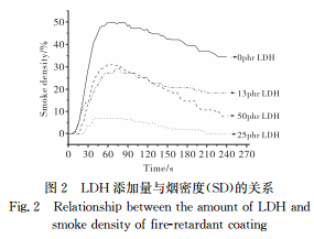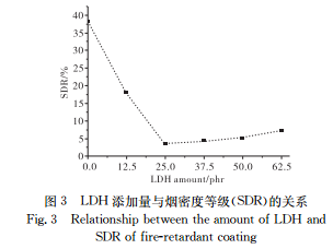 由圖2可知,未加入LDH的阻燃涂料在燃燒60s處最大煙密度高達(dá)50%左右,而加入不同份數(shù)的LDH后,阻燃涂料產(chǎn)生煙霧的時(shí)間不同程度的推遲,并且生煙總量都有降低。加入12份LDH涂料煙密度降低至不到30%;加入25份LDH后,煙密度僅為8%左右。由圖3可知,隨著 LDH添加量的增加,SDR呈現(xiàn)先降低后增高的趨勢(shì)。在加入25份水滑石后,SDR由38降低至3.4;LDH為50份時(shí),煙密度等級(jí)也僅為4.9。這表明LDH在阻燃涂料中有很好的抑煙效果。