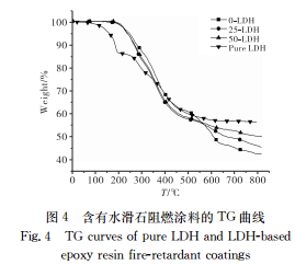 不同含量LDH對(duì)阻燃涂料熱穩(wěn)定性的影響如圖4的TGA曲線所示。