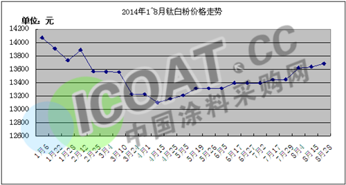 【中國(guó)涂料采購網(wǎng)】在2011年到2014年4月份期間,國(guó)內(nèi)鈦白粉市場(chǎng)價(jià)格持續(xù)處于低迷狀態(tài),雖然中間有過幾次上調(diào),但幅度并不是很大。自4月份以后,國(guó)內(nèi)鈦白粉出廠價(jià)格才有所回暖。我們通過對(duì)國(guó)內(nèi)鈦白粉產(chǎn)能前十家鈦白粉企業(yè)出廠價(jià)格的匯總,以十家鈦白粉企業(yè)出廠價(jià)格的平均值為基準(zhǔn),對(duì)2014年1~8月份鈦白粉市場(chǎng)價(jià)格走勢(shì)進(jìn)行了分析。這十家企業(yè)分別是,四川龍蟒鈦業(yè)股份有限公司、中核華原鈦白股份有限公司、河南佰利聯(lián)化學(xué)股份有限公司、攀鋼集團(tuán)重慶鈦業(yè)股份有限公司、山東東佳集團(tuán)股份有限公司、山東金海鈦業(yè)資源科技有限公司、云南大互通有限公司、攀枝東方鈦業(yè)有限公司、濟(jì)南裕興化工有限責(zé)任公司、寧波新福鈦白粉有限公司,以上十家鈦白粉企業(yè)的總產(chǎn)能達(dá)164萬噸,占全國(guó)鈦白粉總產(chǎn)能的54%。