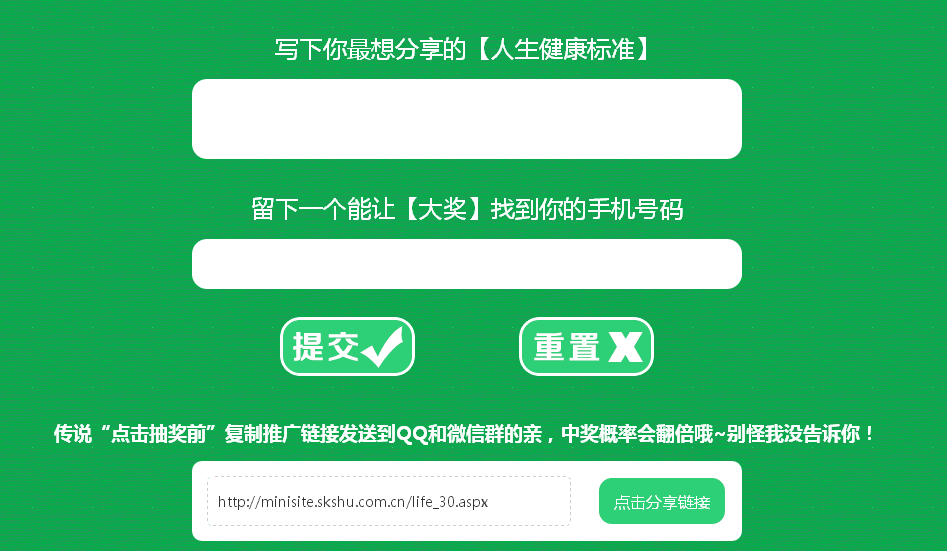 據(jù)三棵樹官方發(fā)布的信息可知,本次活動首先由網(wǎng)友在活動頁面寫下“你最想分享的‘人生健康+標準’”,提交后即可獲得抽獎機會,獎品包含了iPhone6s手機以及踏步機、健腹輪等。隨后從健康宣言中選取50條投票,最終選出前十佳健康宣言,列為三棵樹人生健康+新標準。并送出健康+2萬元刷新服務、體感游戲機、VR眼鏡等大獎。據(jù)悉,“人生30健康+新標準”的評選活動共分三輪,首輪票選10條。后續(xù)還有兩輪活動,共評選出30條。