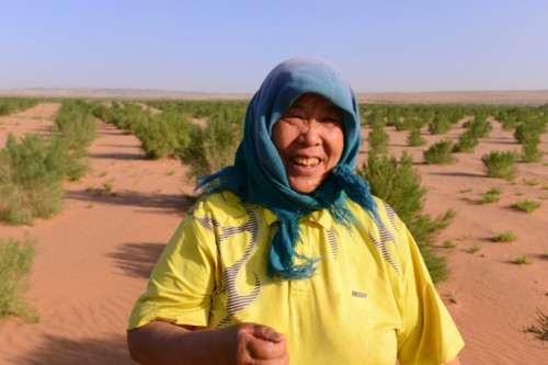 劉金香,50后留守老人,自19歲嫁到阿拉善,已在這片土地上生活了40多年。面對家園的淪陷,腿腳不便的她依然加入種植梭梭的隊伍,一個人趕著驢車參加培訓與下地巡護。她說,“我的理想,就是將自家的3000畝草場種滿梭梭!”