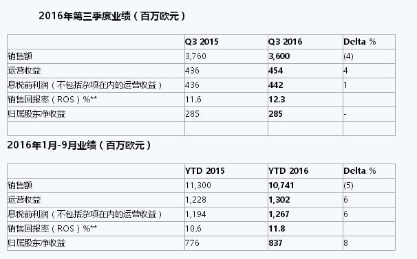 ·息稅前利潤*上升1%,達4.42億歐元(2015年同期為4.36億歐元),得益于持續開展的績效提升舉措和成本降低,匯率的不利影響抵消了部分增長