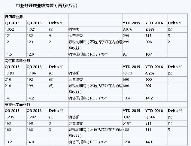 “公司在第三季度盈利能力進一步提高,所有業務領域的回報率均有所增長,裝飾漆和專業化學品的銷量實現增長。我們會進一步改善財務系統實現強大的現金管理。公司已決定將期中股息提高6%,至每股0.37歐元。”