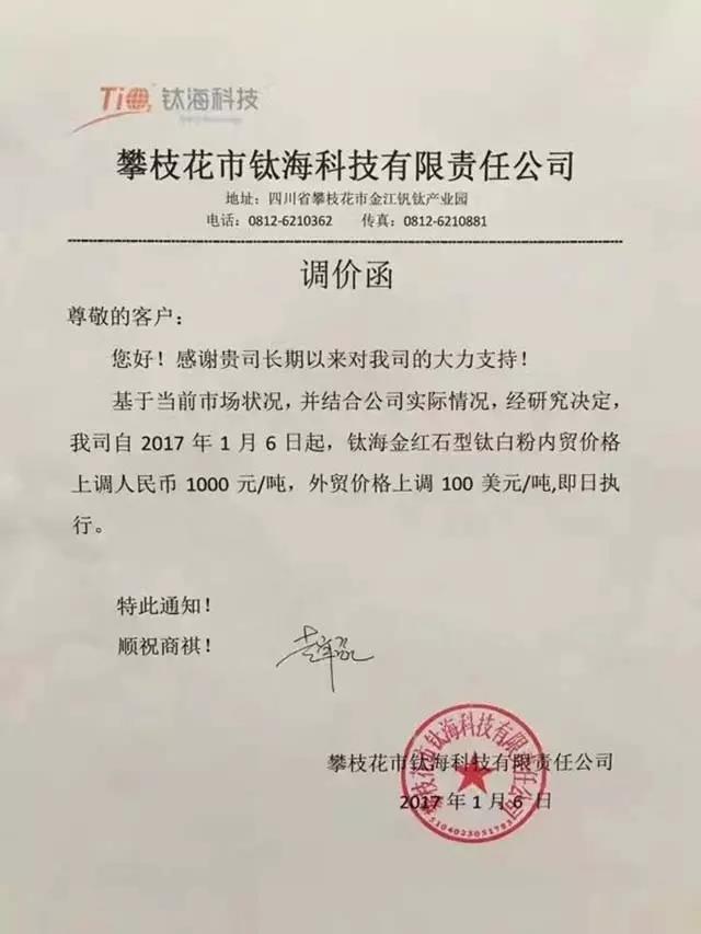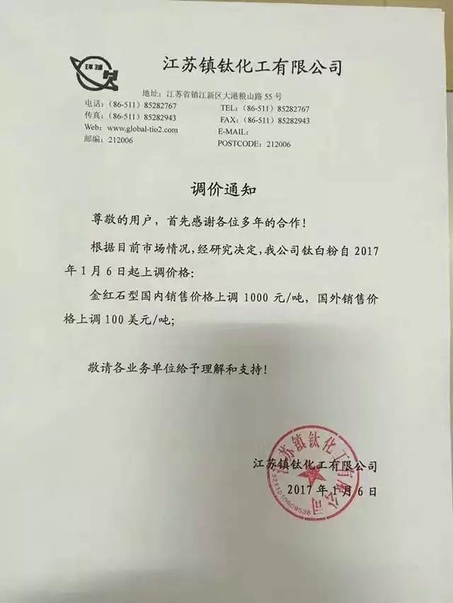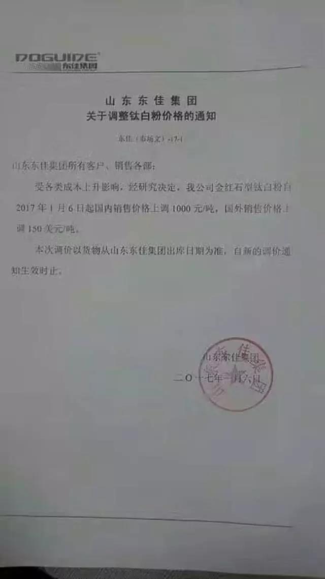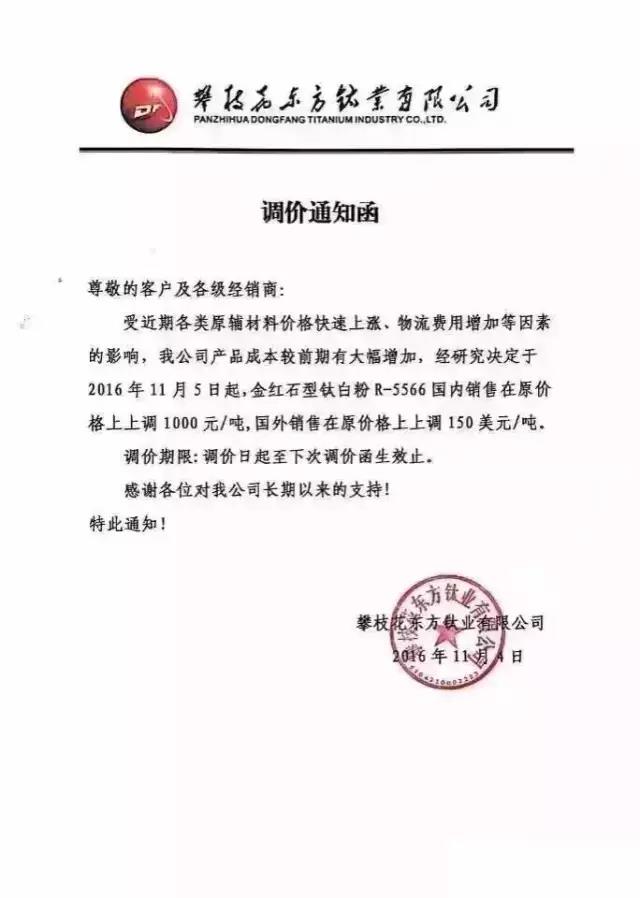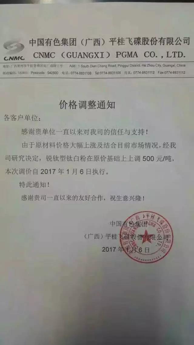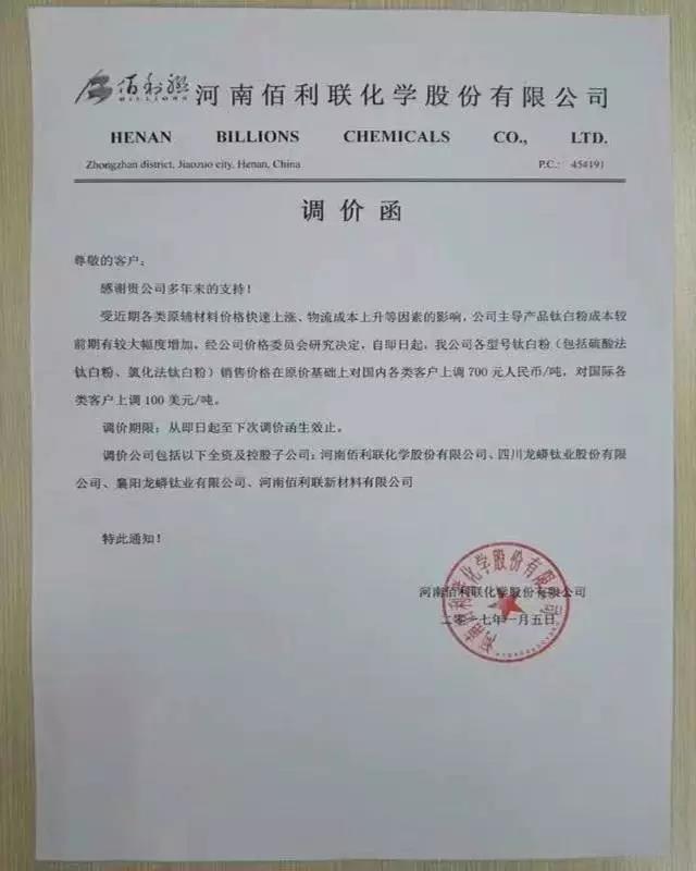 【中國涂料采購網】繼2016年鈦白粉十幾連漲之后,2017年開春之際,鈦白粉企業按耐不住,開始上調產品價格,佰利聯1月5日晚間發布公告,稱自即日起,各型號鈦白粉(包括硫酸法鈦白粉、氯化法鈦白粉)銷售價格在原價基礎上對國內各類客戶上調700元/噸,對國際各類客戶上調100美元/噸。此次漲價是佰利聯繼2016年11月2日提價后的又一次提價。繼昨日鈦白粉龍頭企業龍蟒佰利聯提價后,1月6日平桂飛碟、山東東佳、江蘇鎮鈦化工、攀枝花鈦海科技、攀枝花東方鈦業等鈦白粉企業宣布集體提價,上漲空間在500元/噸-1000元/噸之間,這是2017年鈦白粉企業的首次提價,對涂料行業的影響意義深遠。