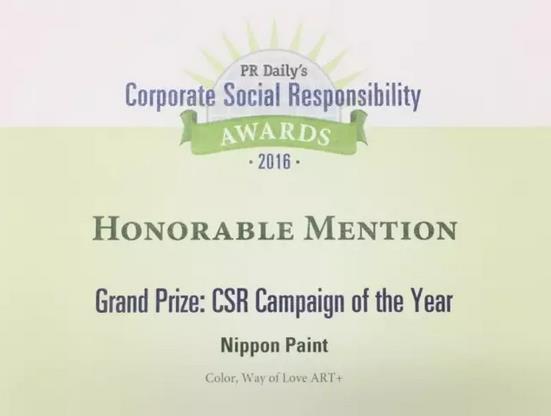 立邦“為愛上色”“藝術+”項目憑借新穎的公益形式,從全球100多個案例中脫穎而出,榮獲Ragan Awards(拉根獎)”2016年度最佳企業(yè)社會責任榮譽獎(CSR Campaign of the Year)。