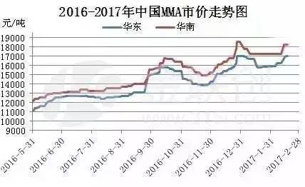 市場是一雙無形的手,2017年我國國內甲基丙烯酸甲酯愈演愈烈的供小于求的局面,刺激了國內甲基丙烯酸甲酯市場無可置疑的積極探漲,然而春節后期短短十幾個工作日內接近千元的市價漲幅或許僅僅是個開始。隨著2017年第一季度、第二季度上海璐彩特、惠菱化成、上海贏創等甲基丙烯酸甲酯生產企業陸續進入停車檢修節點,市場整體供應嚴重緊缺的局面或將加劇,市場價格唯有持續高位探漲一條途徑。